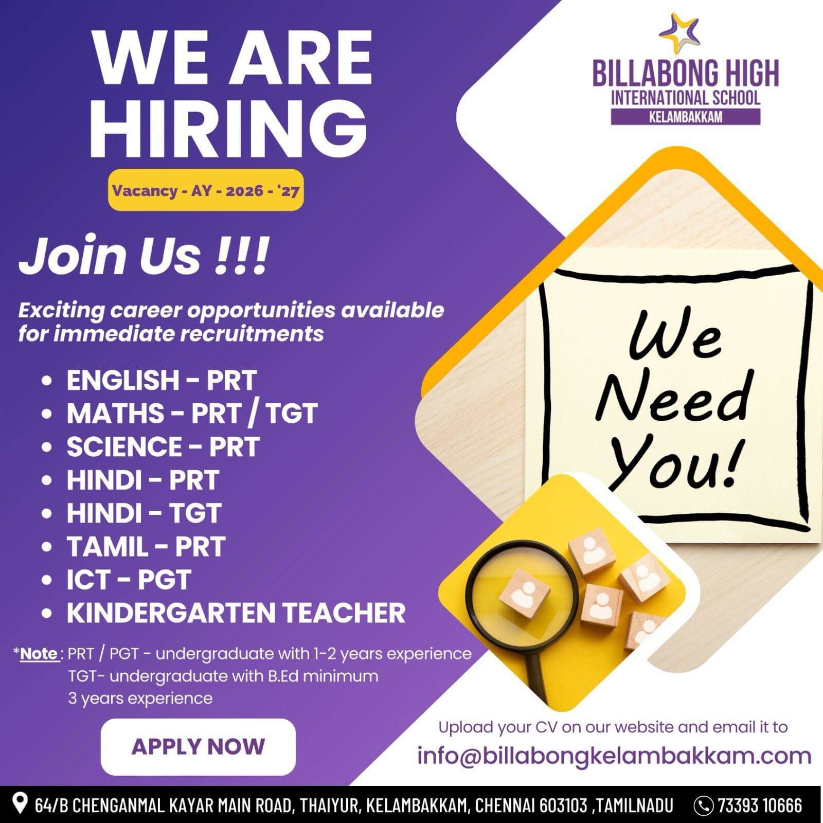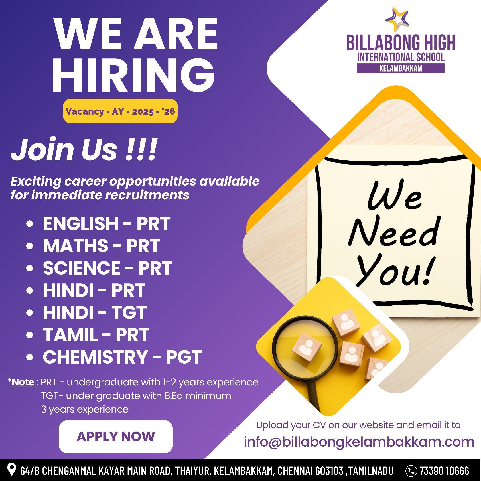 The vacancy mentioned is only for Billabong High International School, Kelambakkam and we don’t have any other branches of our school in any other city.